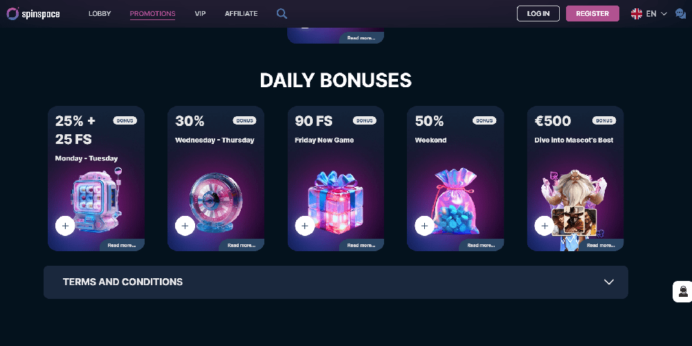 SpinSpace ist eine relativ neue Ergänzung auf dem Online-Glücksspielmarkt. Ihre Bibliothek mit über dreitausend Titeln umfasst eine Vielzahl von Spielautomaten, Sofortspielen, Tischspielen und Live-Casino-Lobbys. Darüber hinaus finden Sie im Aktionsbereich jede Menge verlockende Schnäppchen, die mit dem Versprechen enormer Gewinne noch mehr Lust aufs Spielen machen. Außerdem können Sie von jedem Ort der Welt aus Geld auf Ihr Konto einzahlen oder sich Ihre Gewinne auszahlen lassen, da die Website eine beeindruckende Auswahl an Zahlungsmethoden akzeptiert.