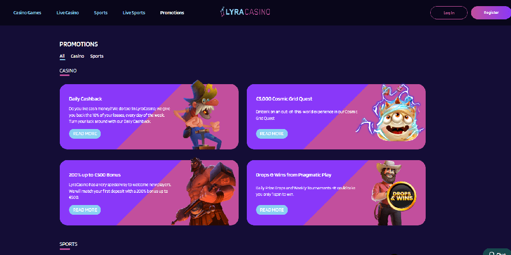 In 2021, DMG Solutions N.V. launched Lyra, a new online casino. A number of additional brands are also under the umbrella of this company. You can get 10% back every day on your net losses from slot bets if you are a registered customer. If your balance falls below $5, you will receive a payment. You will have 7 days to withdraw or use the funds for any games you like. The cashback is completely wager-free, which is a great feature.
