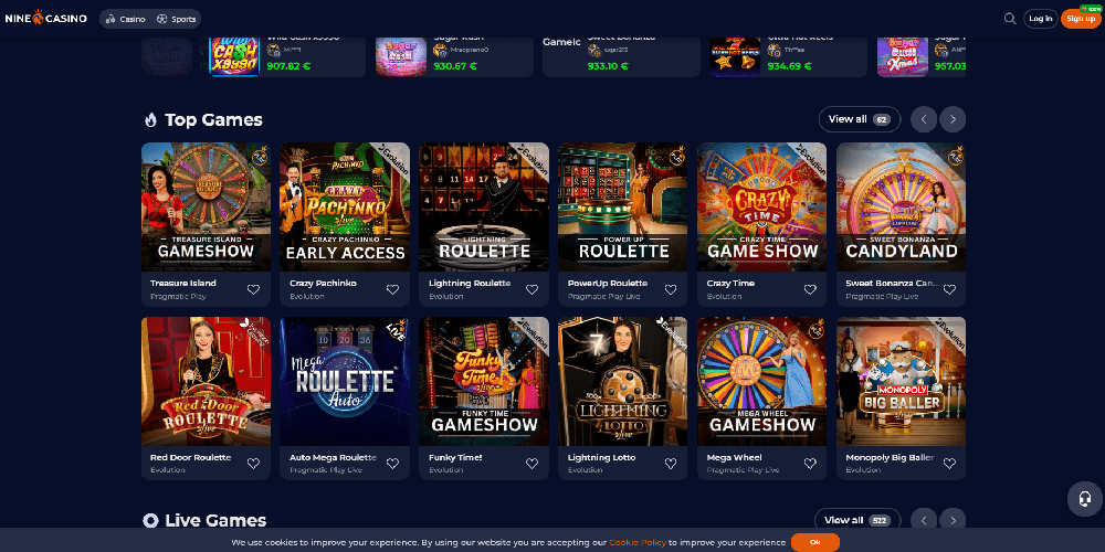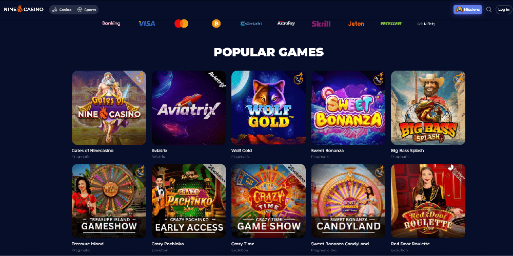 Casino Nine has games created by top-tier software developers including Yggdrasil, Pragmatic Play, Red Tiger, NetEnt, Evolution, Thunderkick, ELK Studios, and BetSoft. Among the lesser but no less interesting providers they carry items from Booongo, Spinomenal, NoLimitCity, Belatra, Playson, Platipus, TrueLab, Habanero, Amatic, GameArt, Bgaming, and many more.