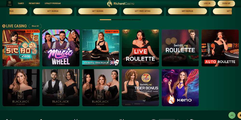 The game selection at Richard Casino is massive, and that is saying a lot. There are more than a thousand games to choose from in the casino's dazzling selection. Let it suffice to state that Richard Casino will obediently accommodate your preference. A Live Casino, a plethora of Slot Machines, and Bonus Buy Games are all available to players. There is no question that variety will be assured.