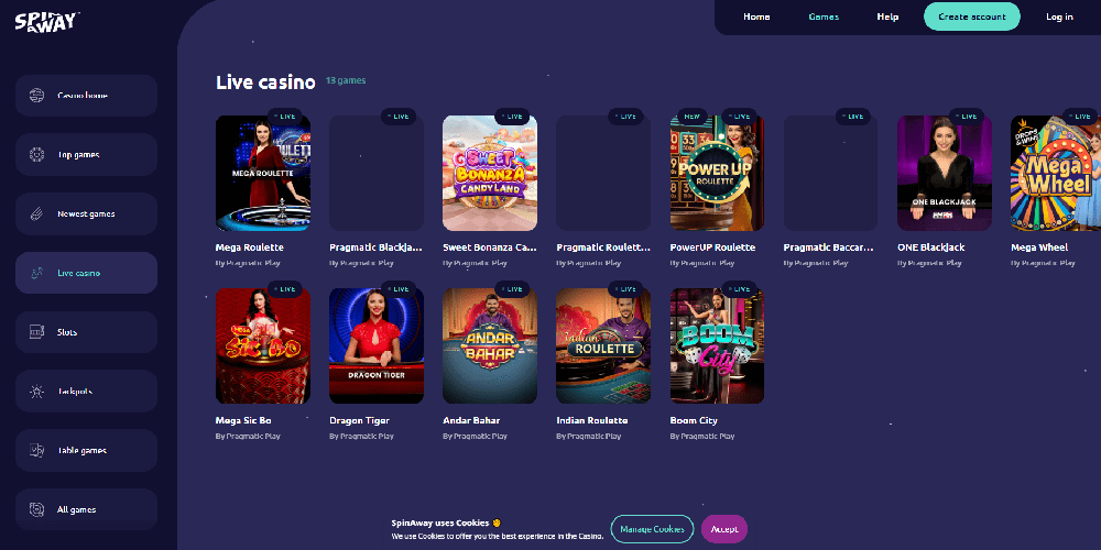 Casino SpinAway boasts a collection of over 800 games, including various forms of blackjack, roulette, table games, slots, and approximately fifteen live games. The game library features titles developed in collaboration with industry heavyweights such as Pragmatic Play, Quickspin, NetEnt, Evolution Gaming, Play'N Go, Big Time Gaming, Thunderkick, and Microgaming, as well as games from smaller studios like STHLMGAMING, Reel Play, Golden Hero, and others.