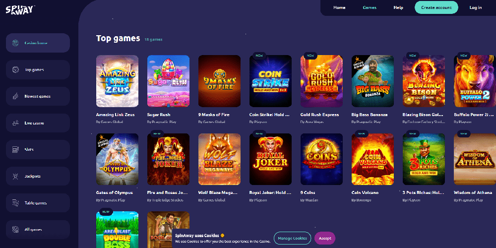 SpinAway's game library features titles developed in partnership with industry heavyweights including Pragmatic Play, Quickspin, NetEnt, Evolution Gaming, Play'N Go, Big Time Gaming, Thunderkick, and Microgaming. Additionally, they host games developed by smaller studios including STHLMGAMING, Reel Play, Golden Hero, Gamomat, Fantasma Games, Foxium, Just For The Win, Skillzzgaming, Tripple Edge Studios, Lightning Box Games, Rabcat, and Reel Play.