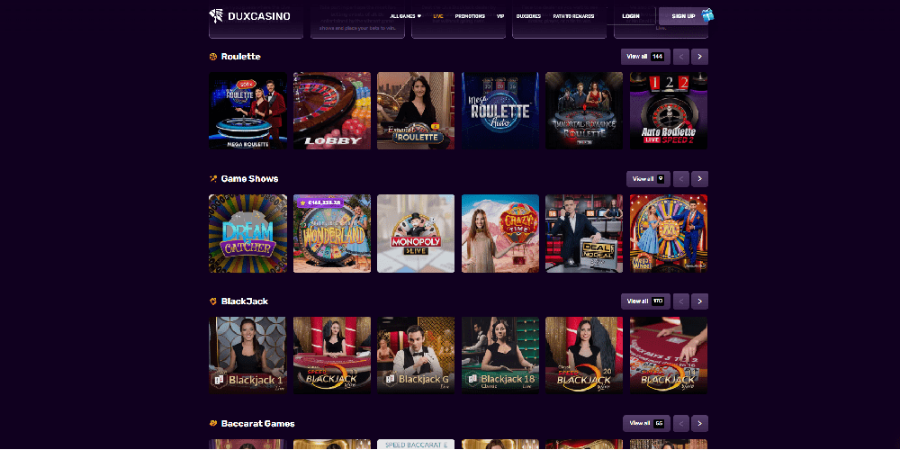 Dux Casino arbeitet mit einer Vielzahl renommierter Spieleanbieter zusammen, darunter Playtech, NetEnt, Microgaming, Play'n GO, Yggdrasil und viele andere. Die Spiele sind in „Beliebt“, „Live-Spiele“ (hauptsächlich Videopoker), „Jackpot-Spiele“, „Poker“ und „Live“ kategorisiert. Während Spieler Spiele nach verschiedenen Kriterien wie Trefferquote, Auszahlung und Volatilität sortieren können, wird im Text darauf hingewiesen, dass eine Sortierung durch den Anbieter keine Option ist.