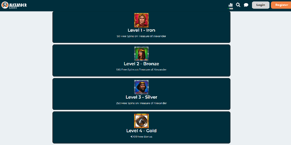 Voit ansaita lisää etuja kasinolla, kun käyt läpi kanta-asiakasohjelman viisi tasoa. Suorittamalla edistymismittarin tehtävät pääset riveissä eteenpäin. Täytä baari kasinolla. Bonukset sisältävät cashbackin kahden viikon välein, ilmaispyöräytyksiä ja ilmaista rahaa.