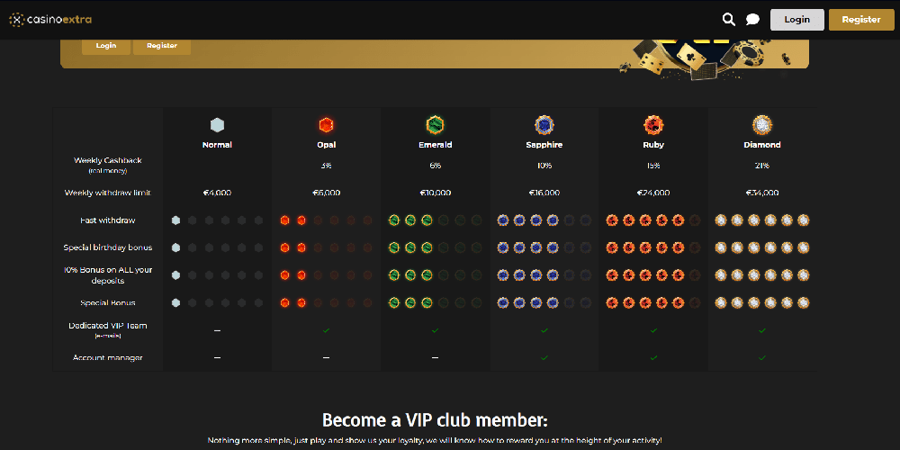 Casino Extra sisältää VIP-jäsenyyden, joka tarjoaa eksklusiivisia etuja omistautuneille pelaajille. Jäsenetuja ovat korkeammat nosto- ja talletusrajat, suuremmat käteispalautusprosentit, henkilökohtainen tilivastaava ja paljon muuta. Pelaajat voivat liittyä VIP-klubiin kasinon mieltymysten perusteella, ja henkilökunta on vastuussa jäsenten valinnasta.