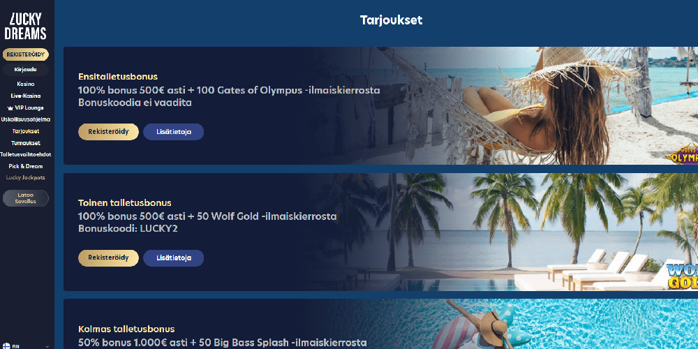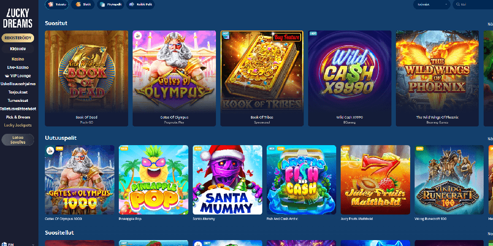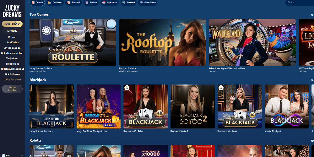 Sweet Bonanza, Money Train, Razor Shark, Book of Dead, Mega Moolah, The Dog House Megaways, Fruit Shop Megaways ja lukemattomat muut ovat vain muutamia LuckyDreamsin video-, jättipotti- ja Megaways-kolikkopelejä. Saatavilla on myös video- ja live-versiot lukuisista pöytäpeleistä ja TV-ohjelmista. Näitä ovat muun muassa eurooppalainen, ranskalainen tai amerikkalainen ruletti, Jacks or Better, Hi-Lo Switch, Caribbean tai Oasis Poker, Casino Hold'em, Pontoon, Sic Bo, Craps, Baccarat, Double Exposure tai Multihand Blackjack, Dragonara, Dream Catcher , Crazy Time ja paljon muuta. Demoversio on saatavana useimmille peleille; Tämä on loistava tapa testata vedet ennen kuin teet mitään oikeaa rahaa.