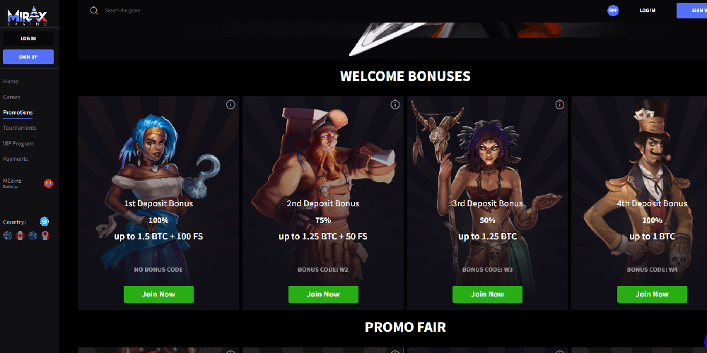 Mirax Casino tarjoaa houkuttelevia kampanjoita, mukaan lukien LootBox Light ja LootBox Pro Bonus maanantaisin, 50 % bonuksen keskiviikkoisin ja viikonlopputarjoukset ilmaiskierroksilla. VIP-ohjelma, joka perustuu MCoins-kertymiseen, tarjoaa Level Up -bonuksia, jotka tarjoavat lisäpalkintoja pelaajien edistyessä kymmenen tason läpi.