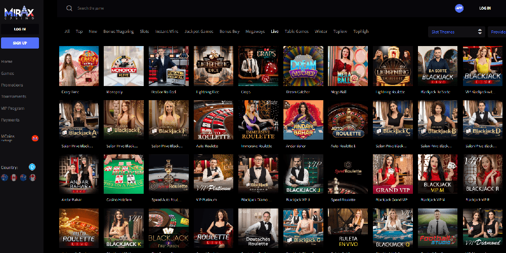 Mirax Casinolla on laaja kirjasto, jossa on yli kolme tuhatta peliä, mukaan lukien lukuisat peliautomaatit, kuten Fisher King, Gemini Joker ja Blockchain Megaways. Alusta tarjoaa lisäminipelejä, kuten Goal, Mini Roulette, Plinko ja Aviator. Monipuolinen valikoima live- ja virtuaalisia pöytäpelejä, joista on saatavilla demoversioita, palvelee erilaisia pelimieltymyksiä.